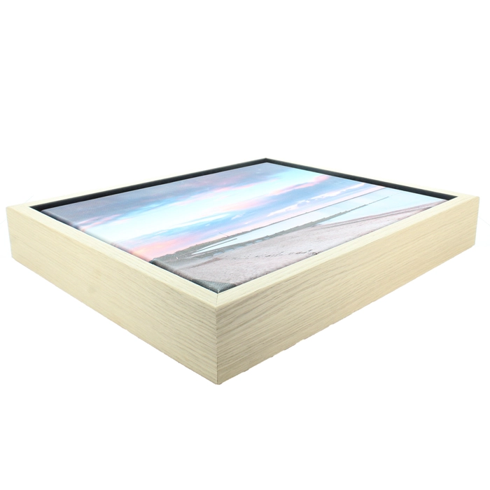 16mm Umbra Oak Veneer Canvas Floater Frame with an internal depth of 40mm. External visible areas all in Oak coloured veneer, with the internal sections painted black. Check out our How-to video for further details of canvas floater frames.