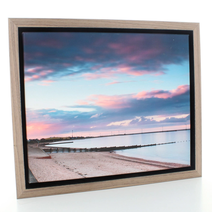 16mm Umbra Walnut Veneer Canvas Floater Frame with an internal depth of 40mm. External visible areas all in Walnut coloured veneer, with the internal sections painted black. Check out our How-to video for further details of canvas floater frames.